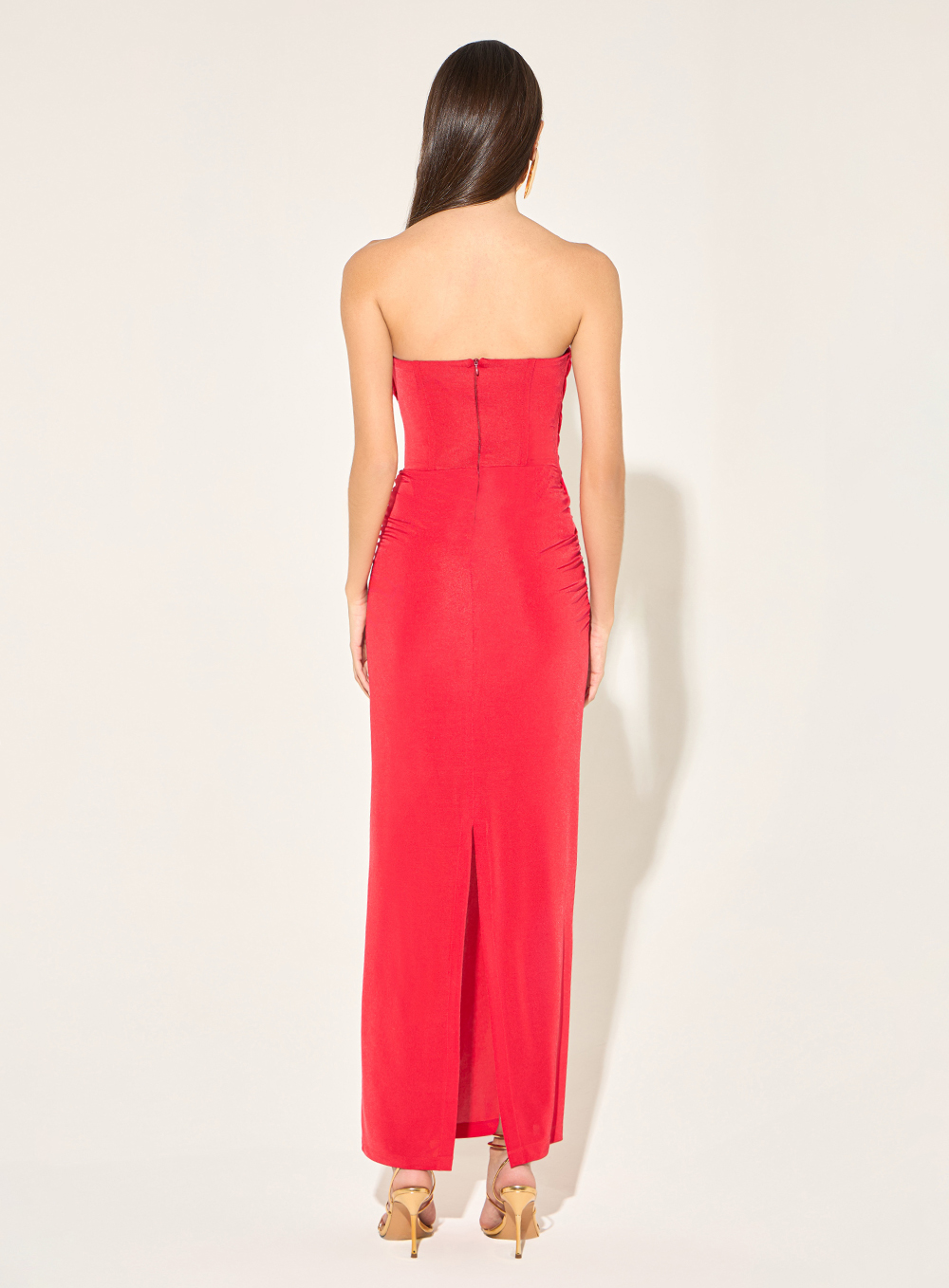 O tom vermelho intenso, atemporal e sofisticado, traduz poder e confiança. O design tomara que caia realça o colo com delicadeza, enquanto a sobreposição cruzada na parte frontal e o sutil franzido nas laterais, na altura do quadril, criam uma silhueta harmoniosa e refinada.