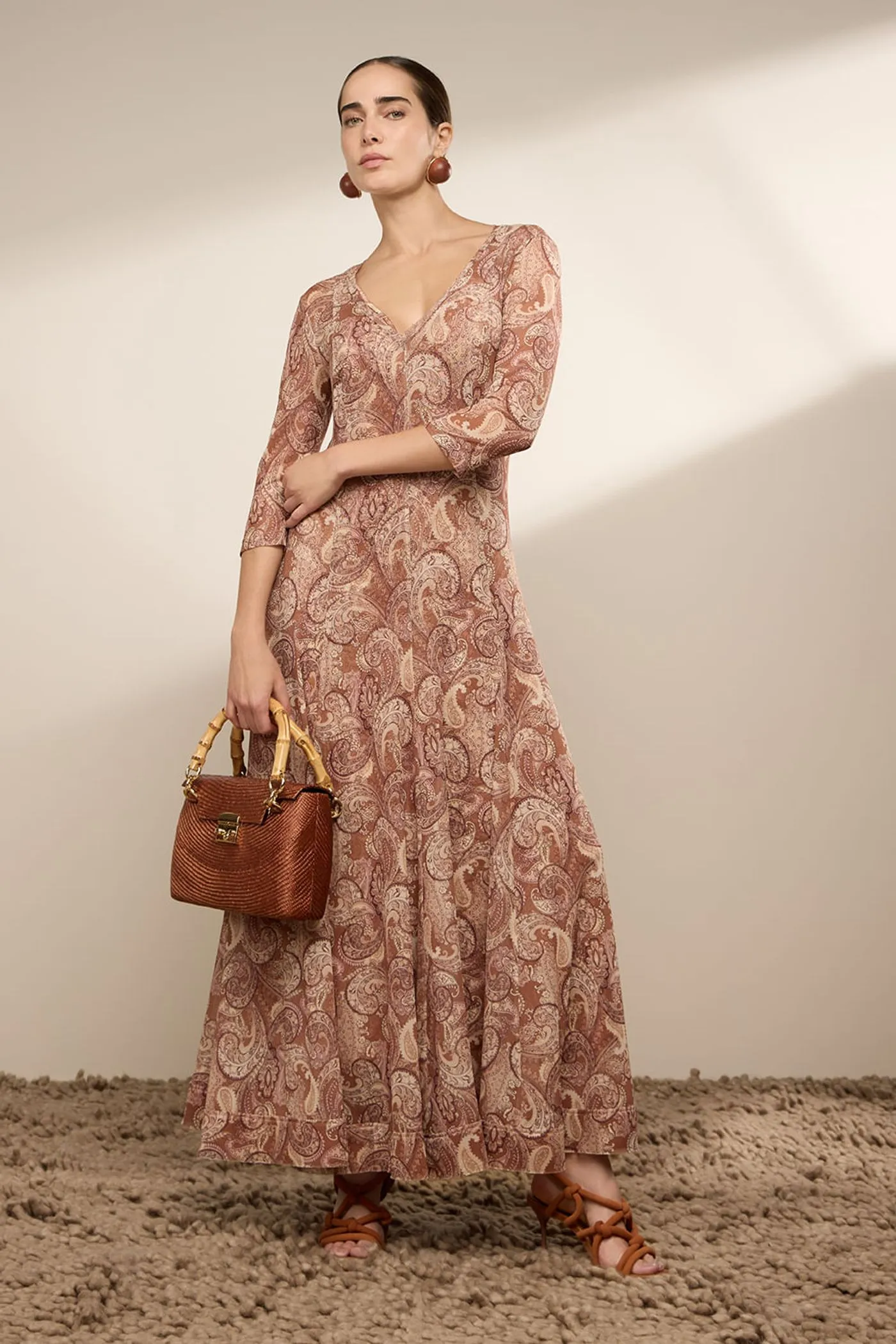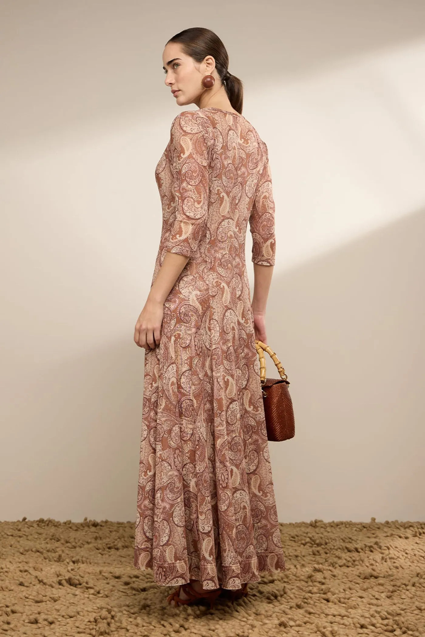 Vestido máxi mídi em tule leve e transparente, apresentado na estampa cashmere color, que traz movimento orgânico ao visual