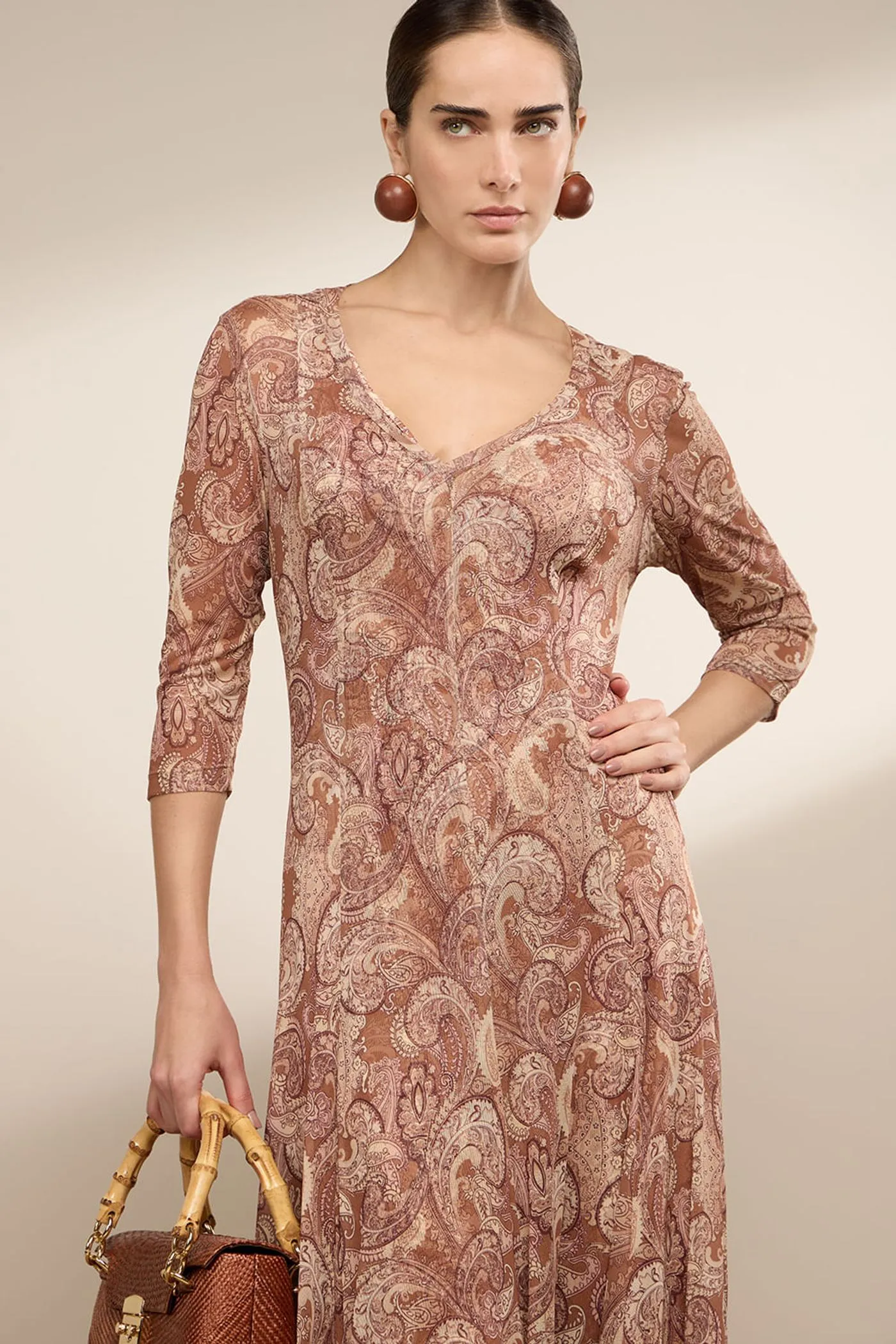 Vestido máxi mídi em tule com estampa cashmere, fluido e sofisticado, com combinete para cobertura elegante.