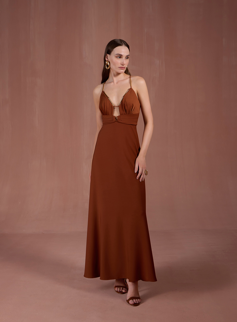 As alças com maxi canutilhos de metal dourado, adicionam um toque de brilho sutil ao visual. Nas costas, o vestido possui uma ampla abertura com amarração em tiras cruzadas, proporcionando um caimento ajustável e um visual marcante. Conta ainda com fechamento em zíper invisível, garantindo praticidade sem comprometer o design.